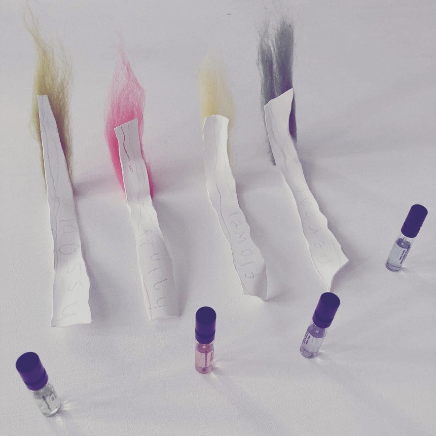 Engraving and color pencil on clay and plastic, merino wool and perfumes, 3ml x4