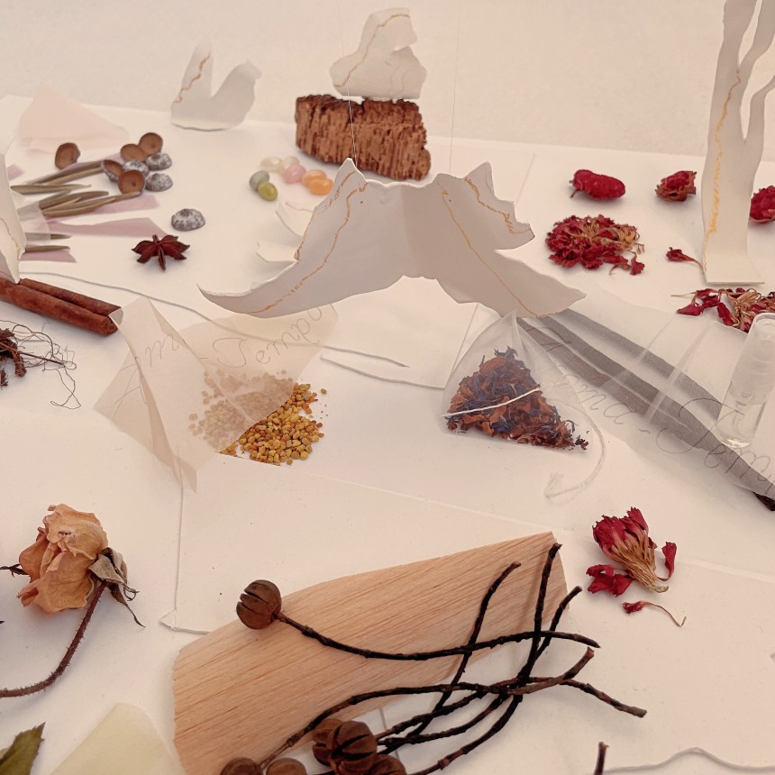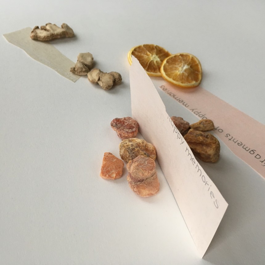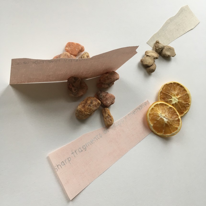 Clay, canvas and plastic, oil pastel, wood and merino wool, alchool and oil based scents