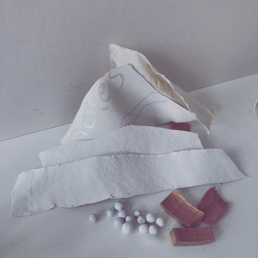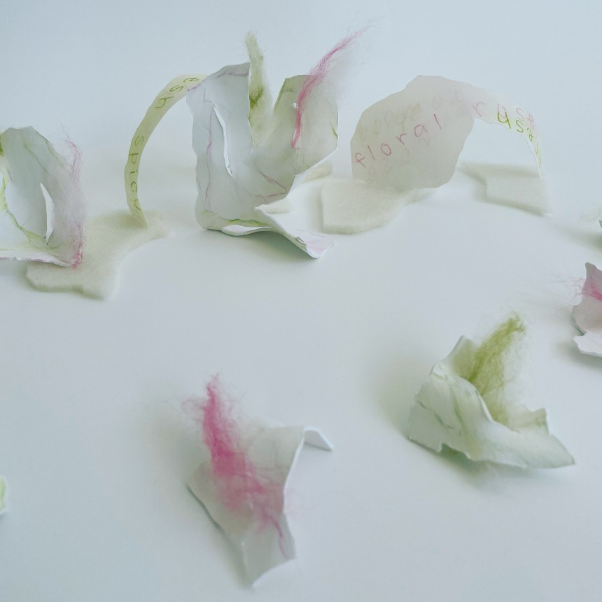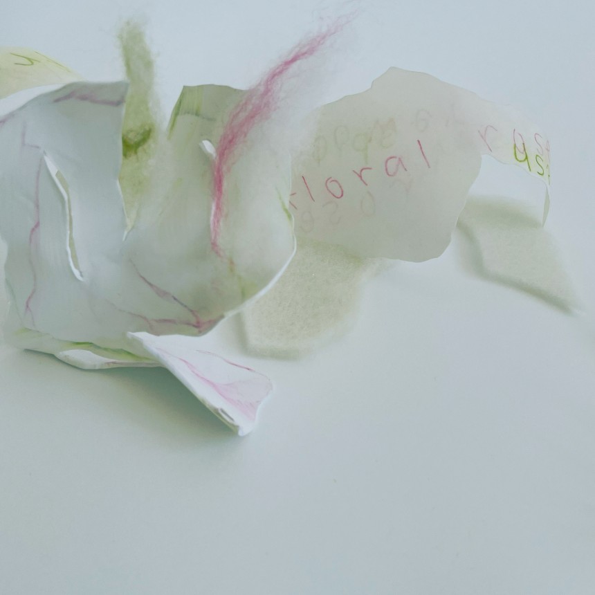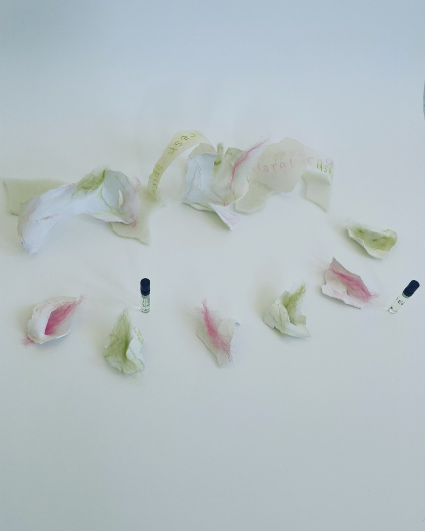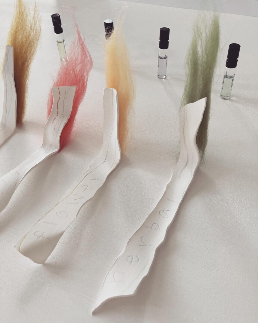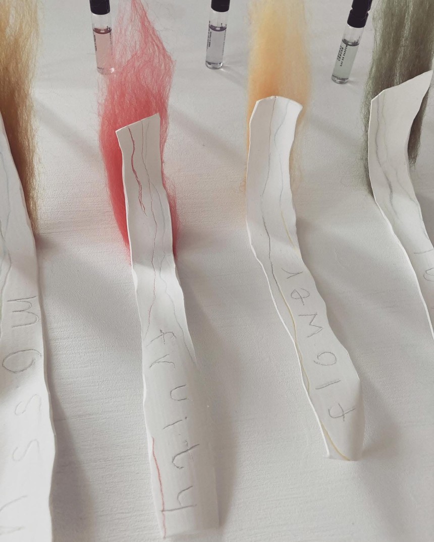 Watercolor pencil on clay, paper and jojoba wax, merino wool and perfume with fresh spicy and floral rose notes, 2ml x2, 90x90x20cm, Detail