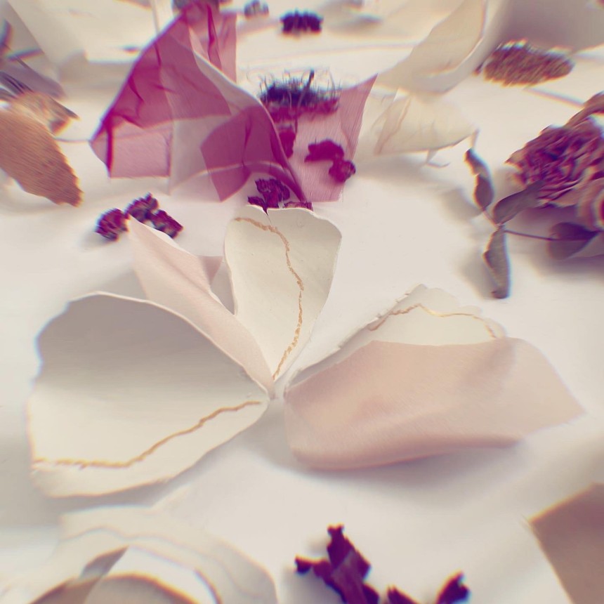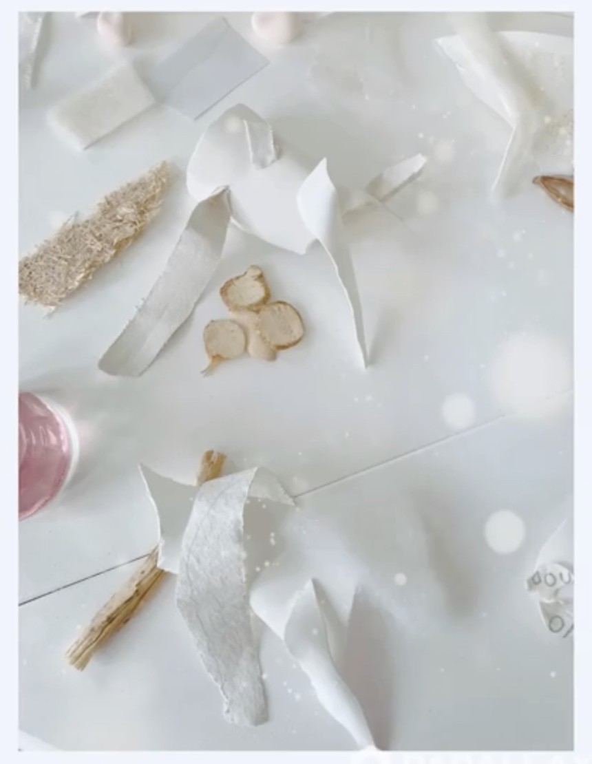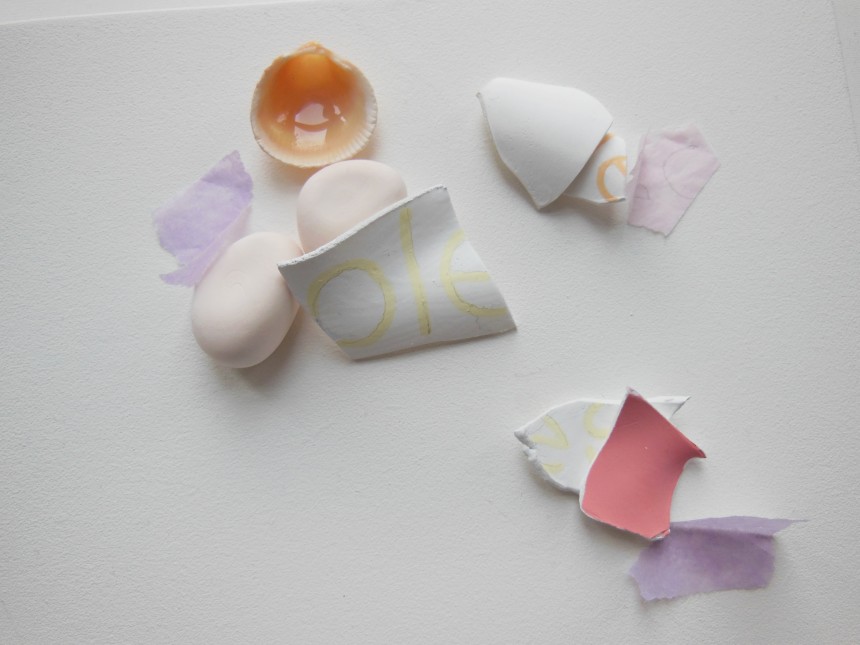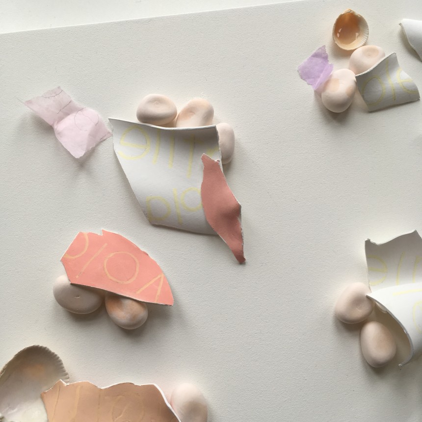 Fragance on ceramic and shell, stucco and claypaint, plastic, pencil on silk paper. 35x25x5cm, Dimensions variable, Detail