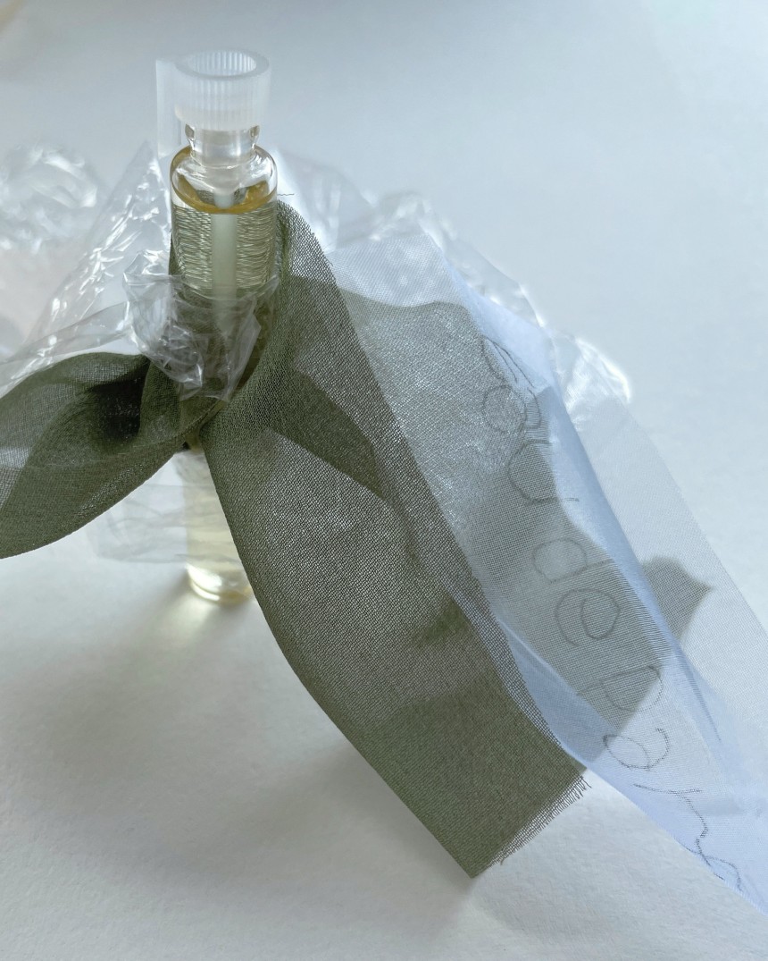 Eau de parfum, glass and plastic, cling film and pencil on silk fabrics, Variable dimensions, 5ml, Detail
